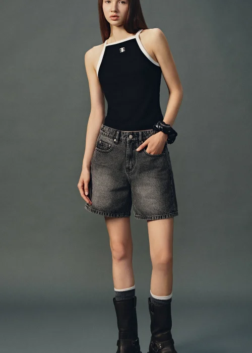 Áo Hai Dây Cổ Tim Viền Tương Phản Thêu Mono